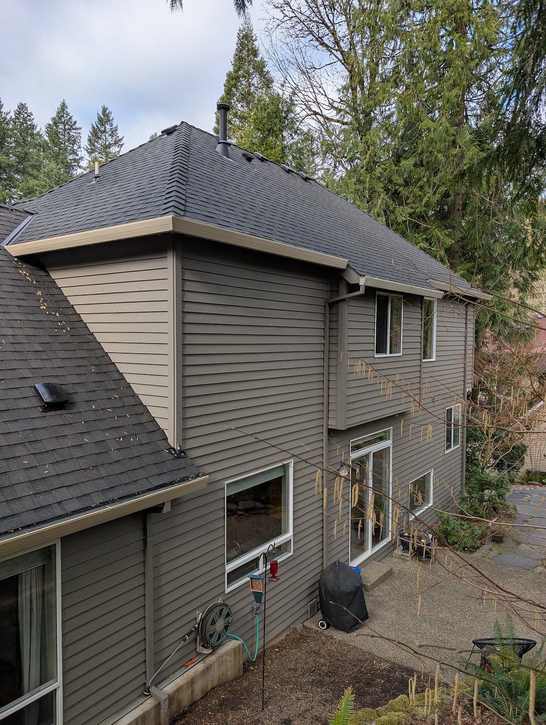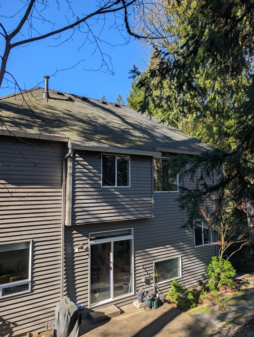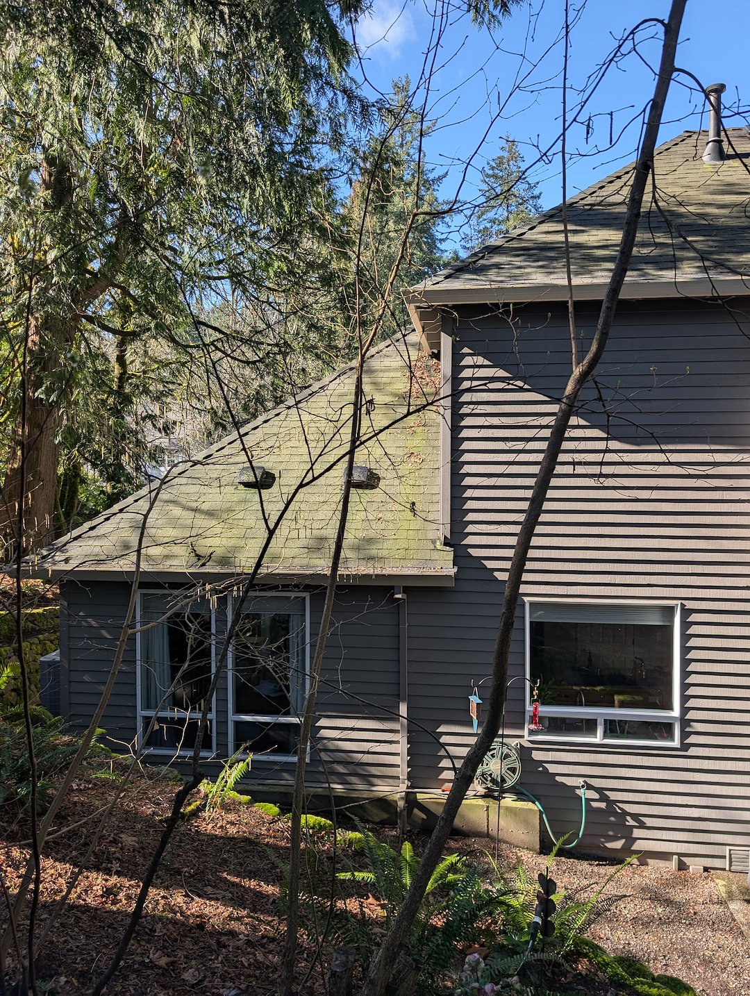 In Portland, OR, Salty Dawg Power Washing completed a roof moss treatment and gutter cleaning project that restored the appearance and function of a home. Our crew started by removing loose debris from the roof surface, using low-impact methods to avoid damaging shingles while making the roof ready for treatment.