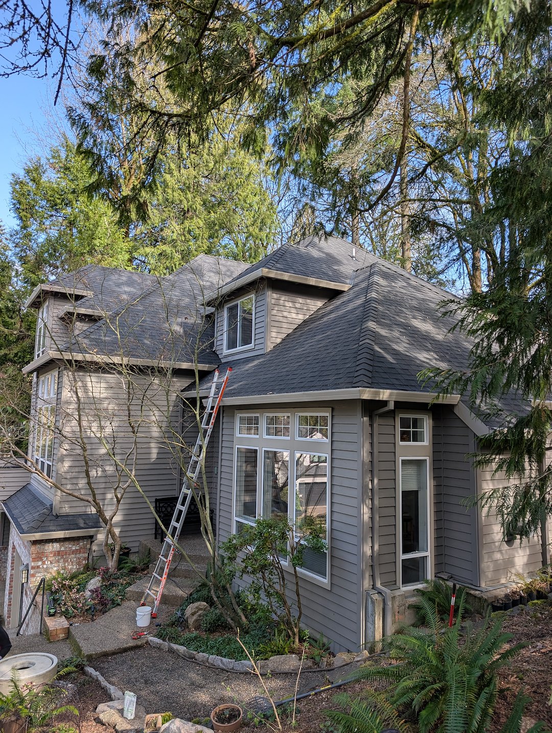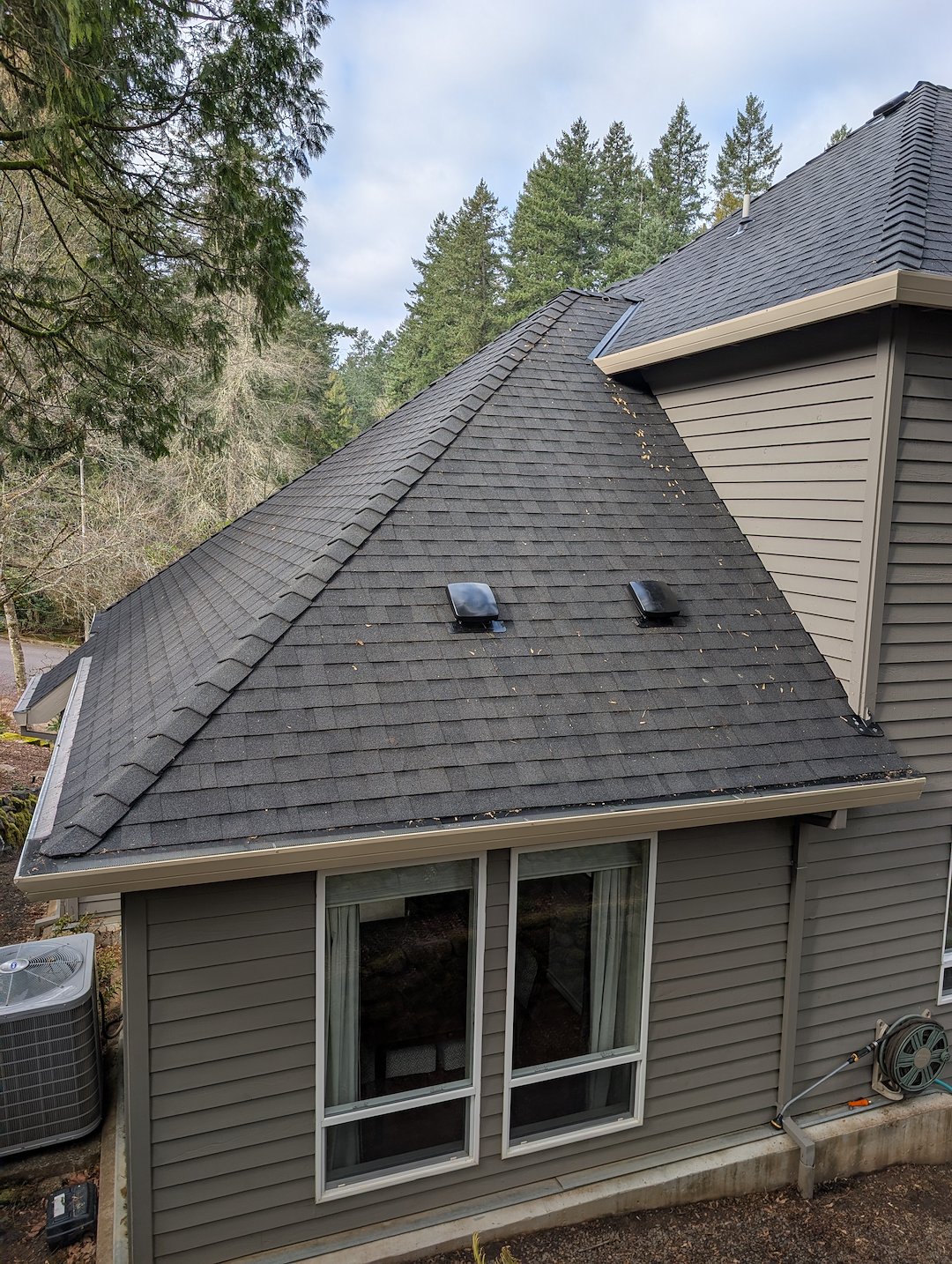 We completed the project with the goal of returning the house to a like-new appearance, and when the job was finished it looked like a brand new house, just as the homeowner described. The gutters were flowing, the roof was cleared of loose debris and moss, and the property was left clean and orderly.