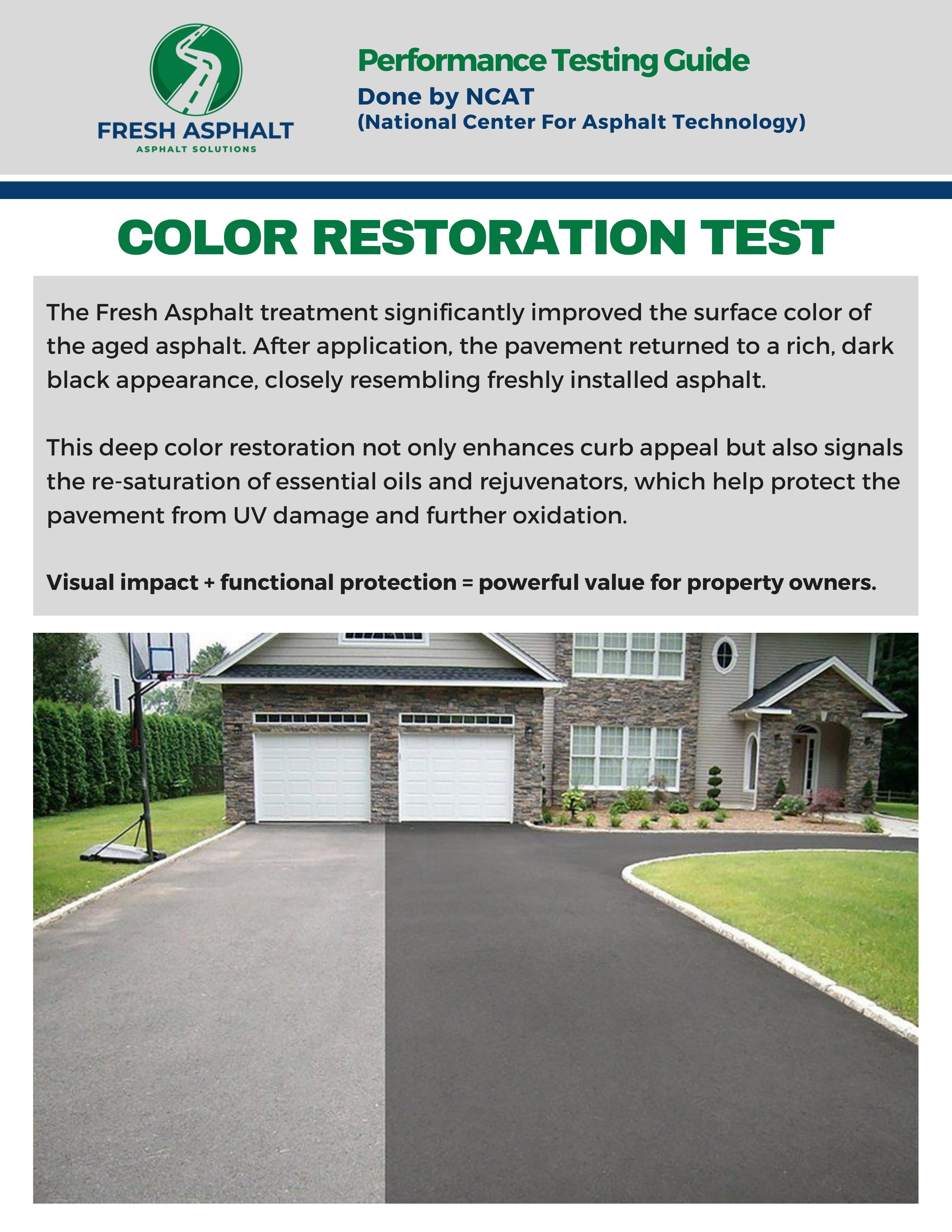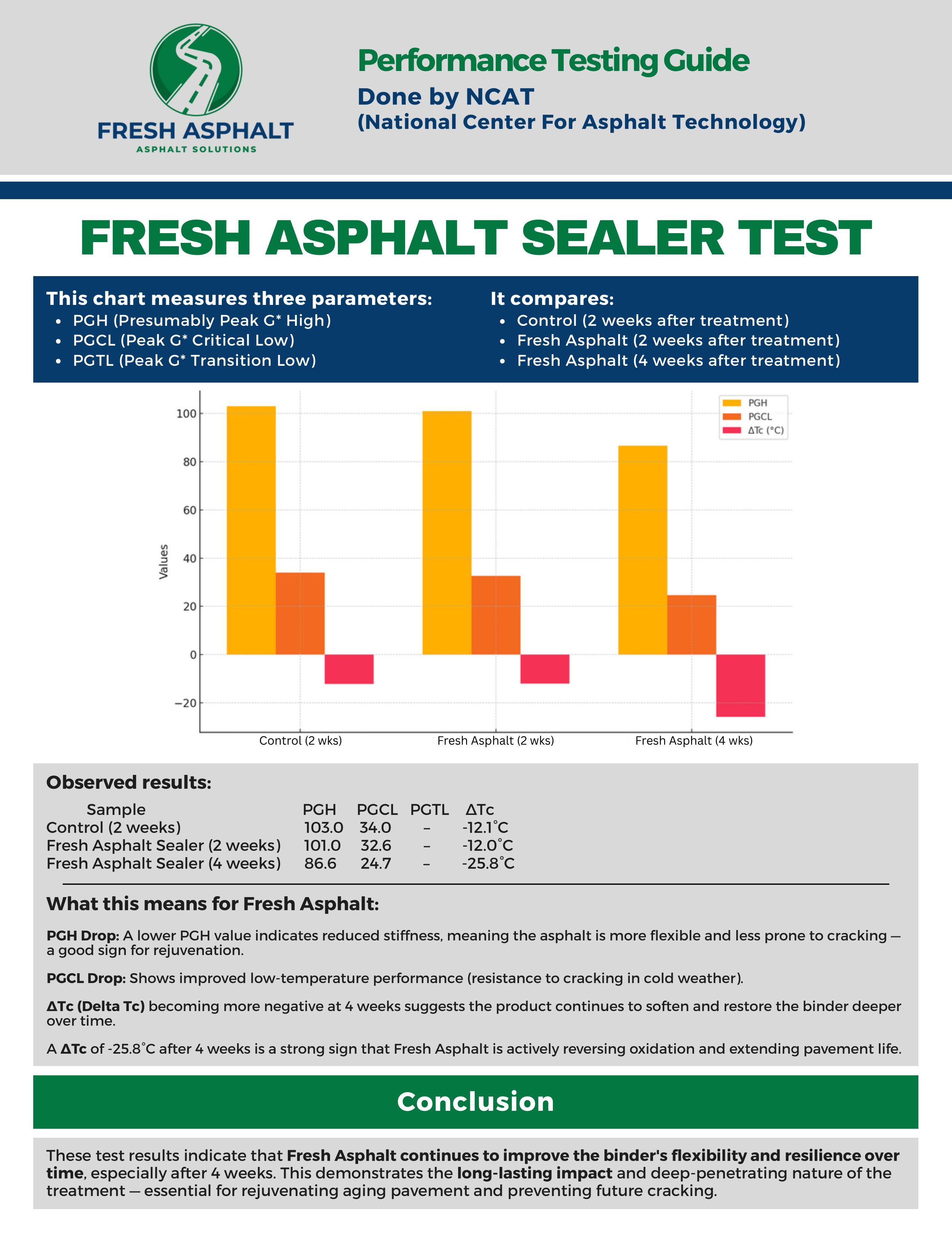 We proudly use Fresh Asphalt™, a next-generation soybean-based treatment that’s both high-performing and environmentally responsible. Independent testing from NCAT (National Center for Asphalt Technology) shows a dramatic drop in asphalt stiffness and cracking potential within just weeks of application.